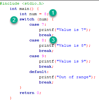 - 在此程序中,由于变量 num 中存储的值为八,switch 将执行 case 标签为 8 的 case。执行 case 后,控制权将移出 switch,程序将成功终止,并在输出屏幕上打印该值。