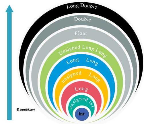 编译器首先继续将字符提升为整数。如果操作数仍然具有不同的数据类型,则它们会被转换为以下层级图中最髙的数据类型。