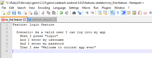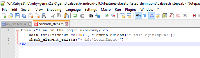 打开“calabash-android-0.9.0”文件夹。它位于路径 C:\Ruby23\lib\ruby\gems\2.3.0\gems\calabash-android-0.9.0。文件夹名称将与您机器上安装的 ruby/calabash 版本同步更改。