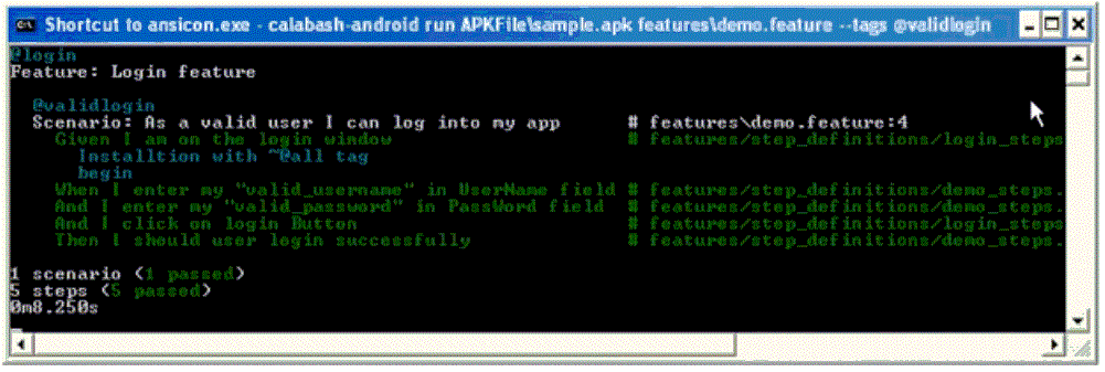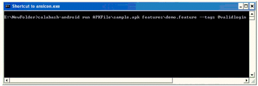 calabash-android run "APK Path" "feature file Path" – tags "tag name"
