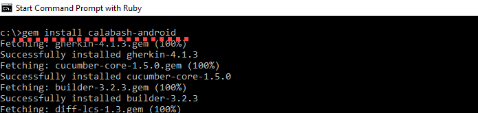 **步骤 1)**在控制台中键入 **install calabash-android**。安装将开始并需要一些时间才能完成