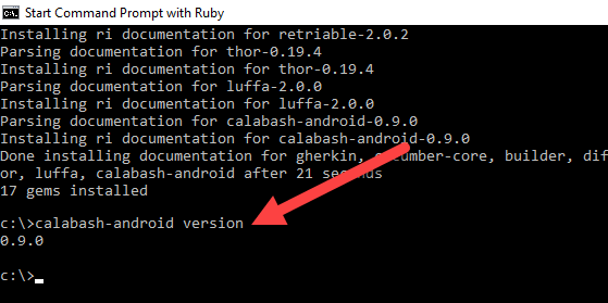 **步骤 2)**安装完成后,键入 **calabash-android version**
