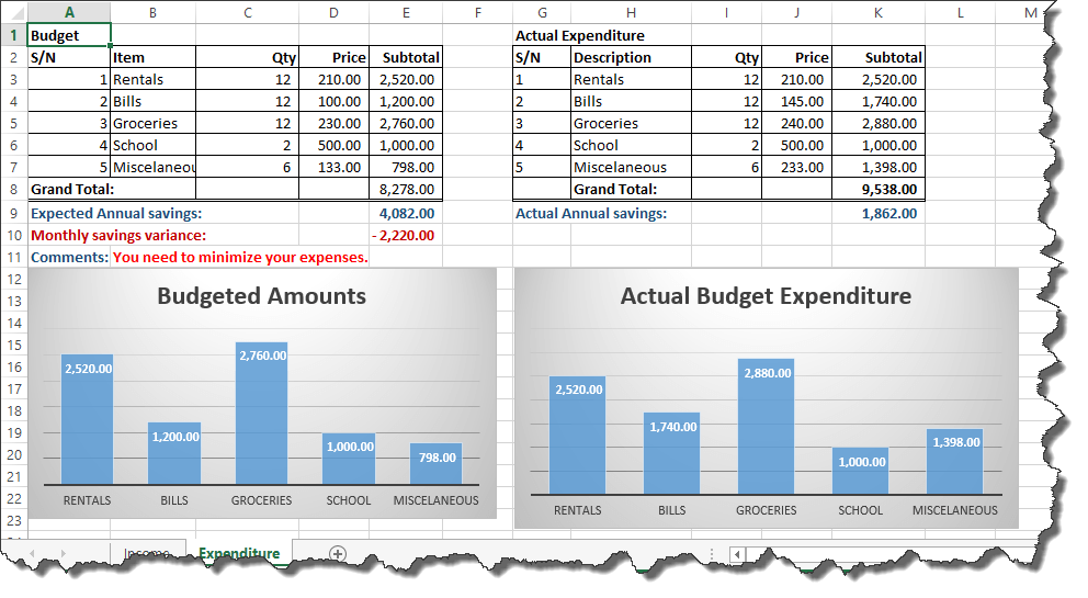 - 在表格下方添加一个注释行。使用 IF 函数,如果差异小于零 (0),则显示“您需要尽量减少开支”,否则显示“出色地遵守了预算”。