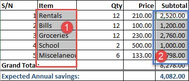 按住键盘上的 Ctrl 键,然后突出显示“小计”列中的 **1 到 5 项**。