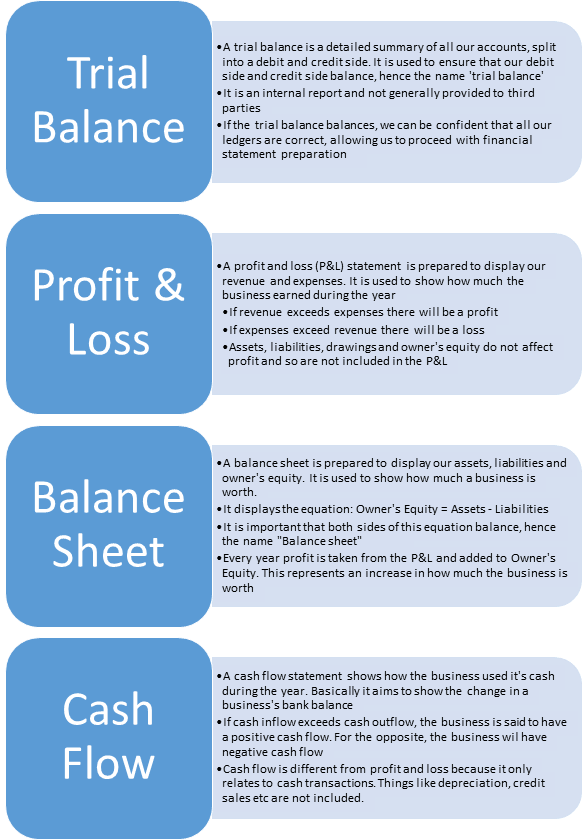 | 显示的关键信息 | 确认我们的借方账户与贷方账户平衡 | 年利润/亏损 | 企业净资产的价值 | 银行余额的增加/减少 |