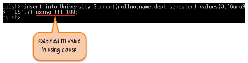 insert into University.Student(rollno,name,dept,semester) values(3,'Guru99','CS’,7) using ttl 100;