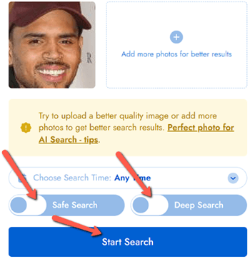 步骤 2)现在,通过点击“安全搜索”或“深度搜索”来筛选搜索。然后选择图片上传的时间,这将允许您找到最新和最旧的照片。最后,点击“搜索”以获取结果。
