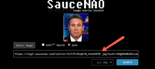 步骤 1)首先访问 https://saucenao.com/,然后粘贴 URL 或上传您想搜索的图片。您可以选择数据库或将其保留为 All DBs,然后点击“搜索”。
