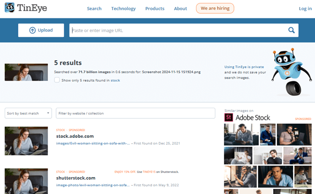 我的表妹想查找她当前的 Hinge 约会对象,找出哪些是冒牌货。所以我使用了 TinEye 的常规搜索和 MatchEngine 来验证图片的真实性。它甚至可以查找经过大量滤镜处理的图片,这使她能够轻松地筛选出约会对象。但是,它不显示社交媒体图片,因此建议使用其他搜索工具来查找关联账户。