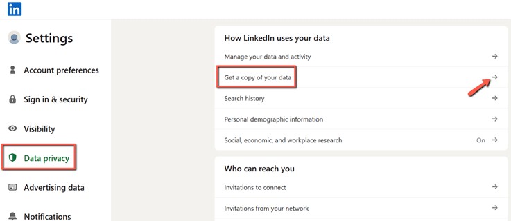 第二步:现在,转到“数据隐私”选项并点击它。接下来,导航到“获取您的数据副本”并点击旁边的箭头。