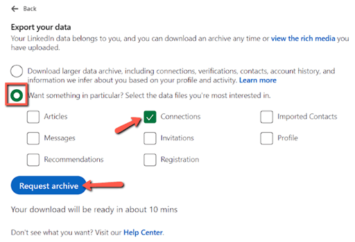 第三步:现在勾选“连接”框,然后点击“请求存档”。确保选择第二个选项,“想要特定的内容?…”以使用此方法。