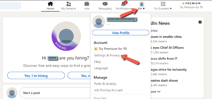 第一步:首先,点击 LinkedIn 主页顶部的个人资料图片,然后从下拉菜单中选择“设置和隐私”。