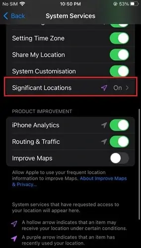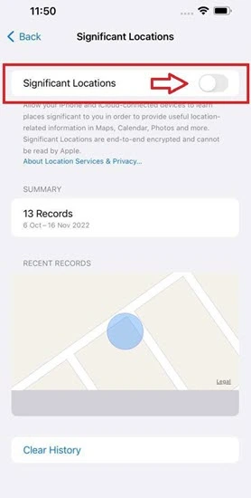 如果切换按钮从绿色变为灰色,您的 iPhone 将不再保留记录。然后,它将限制跟踪位置记录的应用程序,并且您将无法查看您的 iPhone 位置记录。
