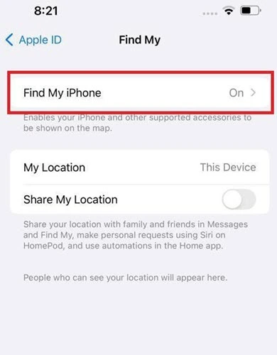 步骤 3) 点击查找我的 iPhone 并将其打开。