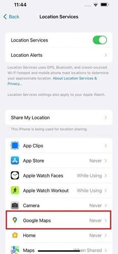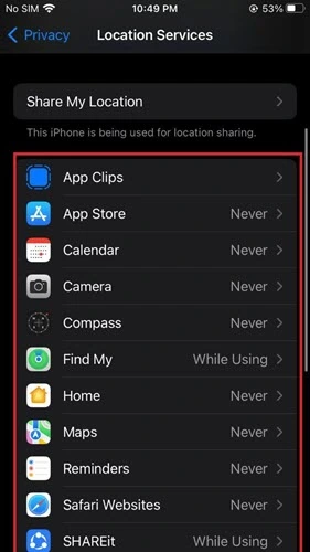 步骤 2) 在此处,您将看到可以访问您的位置记录的应用程序列表(如果您允许它们)。