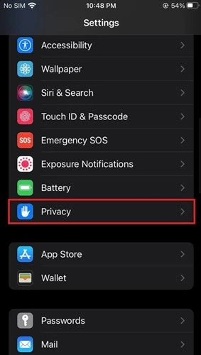 步骤 1) 在 iPhone 的设置中,点击隐私和位置服务。