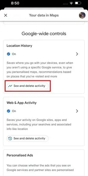 步骤 4) 点击“位置记录”下的查看和删除活动按钮。