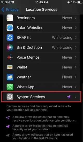 在系统服务中,您将看到可能访问您 iPhone 最近位置的服务列表。带有紫色“查找我的 iPhone”图标的已启用服务是最近访问您位置的服务。
