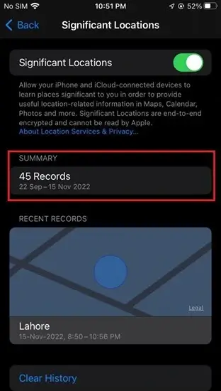 步骤 2) 在重要位置页面上,您会在地图下方找到清除历史记录选项。