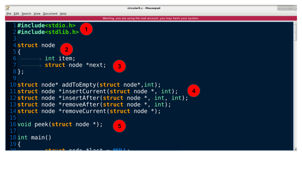 - 代码中无需分配 NULL。循环列表除非完全解除分配,否则永远不会指向 NULL 指针。