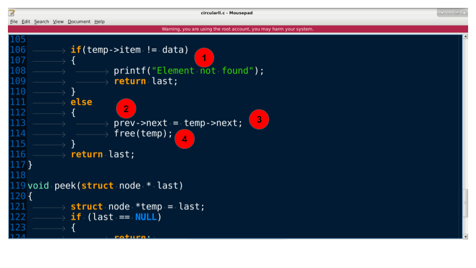 - 前一个指针链接到要删除的元素(temp)指向的“下一个”地址。