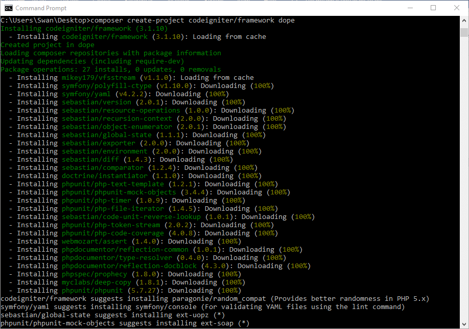 - composer create-project CodeIgniter/framework online-store Composer调用composer程序,create-project下载指定的项目框架,该框架位于CodeIgniter命名空间中。
