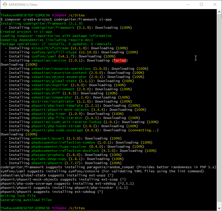 - 上面的命令使用最新的稳定版本(3.1.9)创建了一个CodeIgniter项目版本3,该项目位于ci-app目录中。