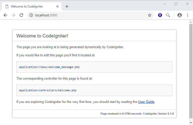 如您在上面网页中看到的那样,上面显示的页面是由位于application/views/welcome_message.php的视图渲染的,而负责的控制器位于application/controllers/Welcome.php。