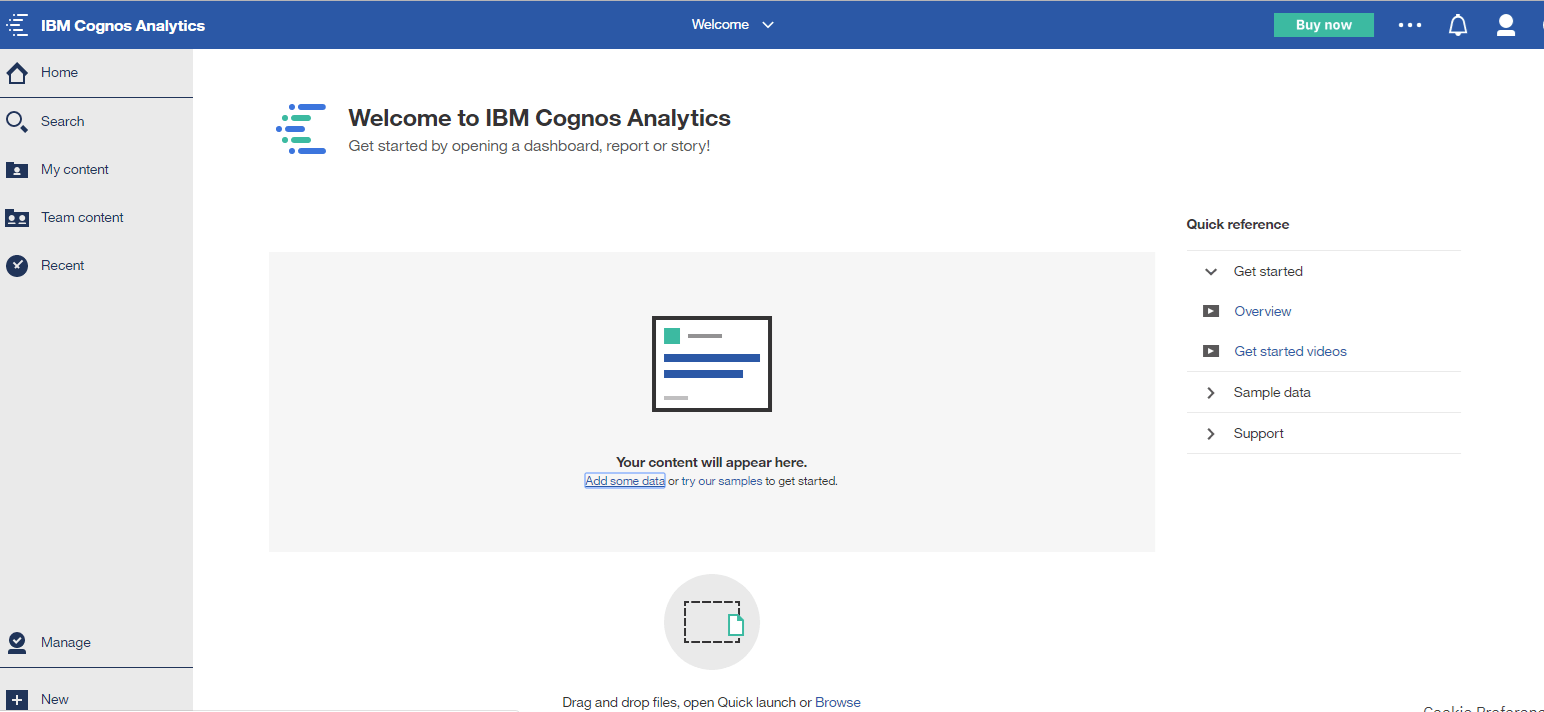 您将看到主屏幕,以及消息“欢迎使用 IBM Cognos Analytics”。