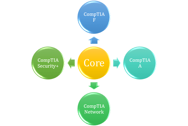 核心技能认证被归类为 CompTIA F+、CompTIA A+、CompTIA Network+、CompTIA Security+。