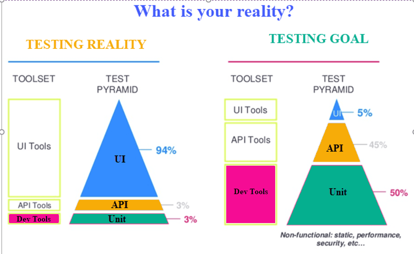 软件开发与过去不同,我们已将开发周期从数月缩短到数周。当前的测试栈(见上图)倾向于 UI 测试。但目标是拥有越来越多的自动化单元测试。