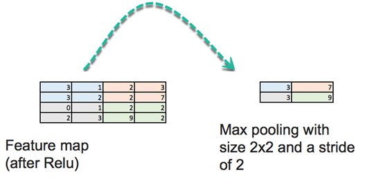 在第三步中,您添加一个池化层。此层减小输入的大小。它通过取子矩阵的最大值来做到这一点。例如,如果子矩阵是 [3,1,3,2],则池化将返回最大值 3。