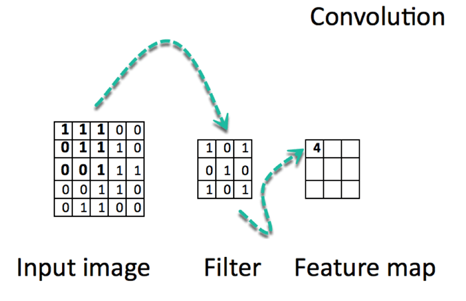 卷积阶段会将滤波器应用于图像中的一小块像素。滤波器会沿着输入图像移动,通常形状为 3x3 或 5x5。这意味着网络会将这些窗口滑过所有输入图像并计算卷积。下图显示了卷积是如何操作的。块的大小为 3x3,输出矩阵是图像矩阵和滤波器之间逐元素运算的结果。