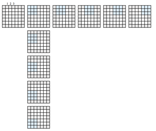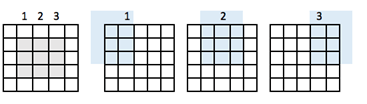 图像具有 5x5 的特征图和 3x3 的滤波器。中心只有一个窗口,滤波器可以从中筛选 3x3 的网格。输出特征图将沿 3x3 的维度缩小两个瓦片。
