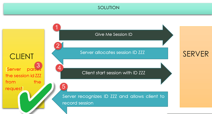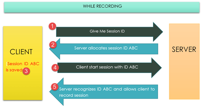 - 客户端使用先前录制的会话 ID ABC 启动会话,并向服务器发送请求以允许其录制。