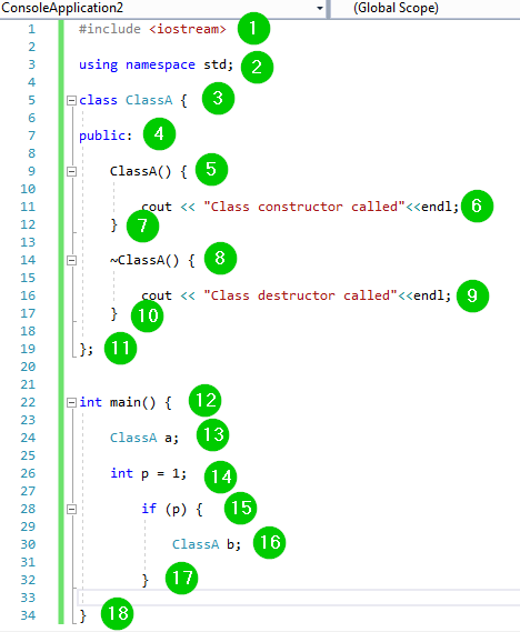 - 析构函数被调用时在控制台打印的文本。endl 是 C++ 关键字,表示 end line(换行)。它将光标移动到下一行。