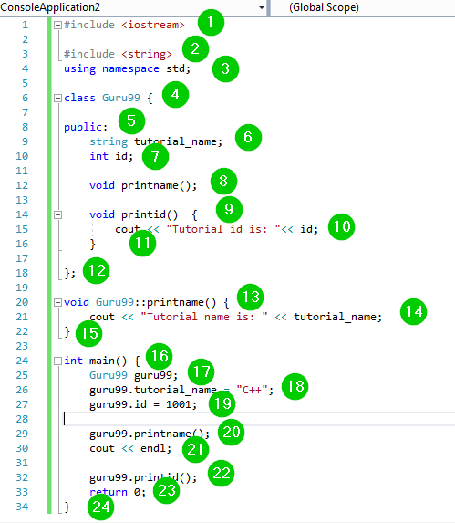 如果一个函数要在类定义外部定义,我们必须使用作用域解析运算符 (::)。这应该伴随类名和函数名。