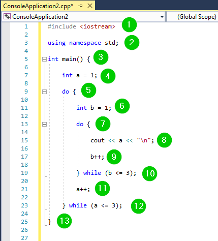 - 外部循环体结束。测试表达式已添加到循环体的末尾。它测试 a 的值是否小于或等于 3。