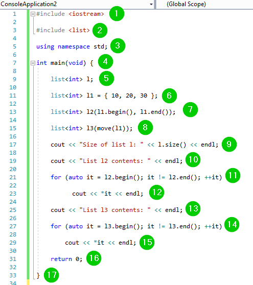 - 填充构造函数 std::list::list() - 它创建一个包含 n 个元素的列表,并将每个元素的值设置为零 (0)。