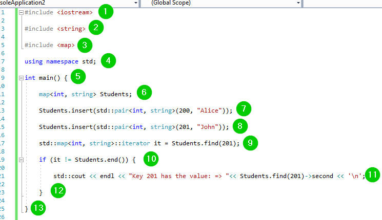 - 将 map 头文件包含到我们的代码中以使用其函数。