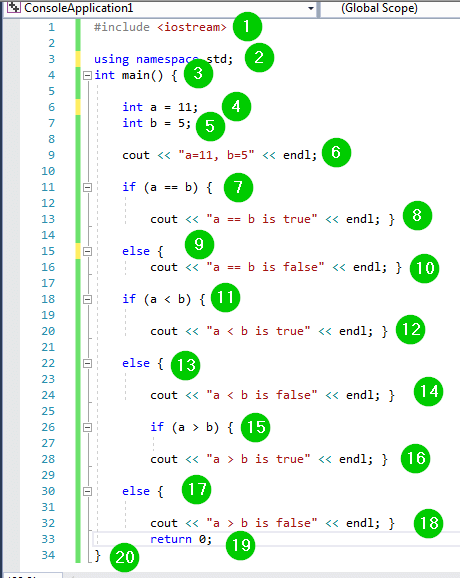 - 在if决策语句中执行算术运算a==b,以了解其为真还是为假。{ 标志着if语句体块的开始。
