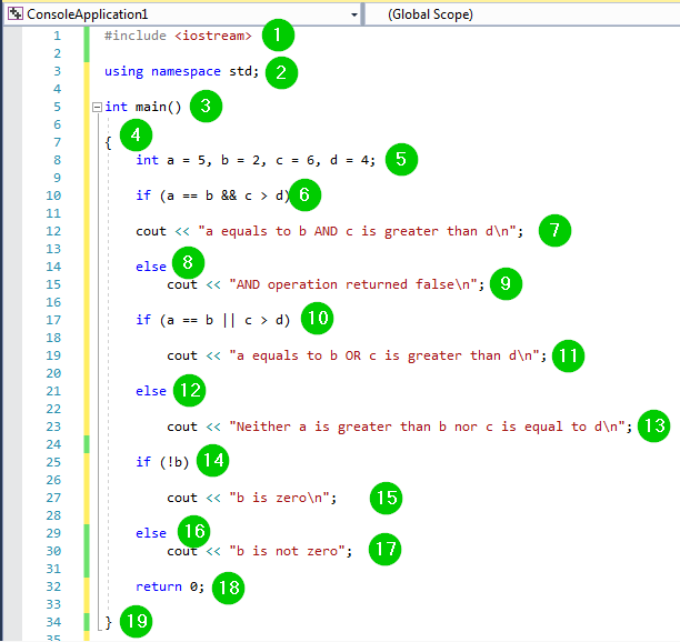 - 如果上述if语句为假,则在控制台上打印的文本。endl是C++中的换行关键字。它会将光标移到下一行开始打印。}标志着else语句体块的结束。