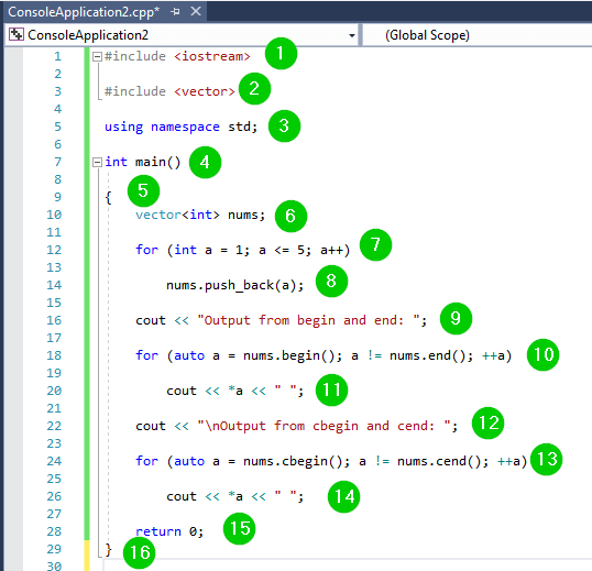 - 使用迭代器变量 a 从开头到末尾之后遍历 vector nums 的元素。注意我们使用的是 vector::begin() 和 vector::end() 迭代器。