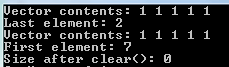 - 清除所有内容后,将 vector num 的大小与其它文本一起打印。它应该返回 0。