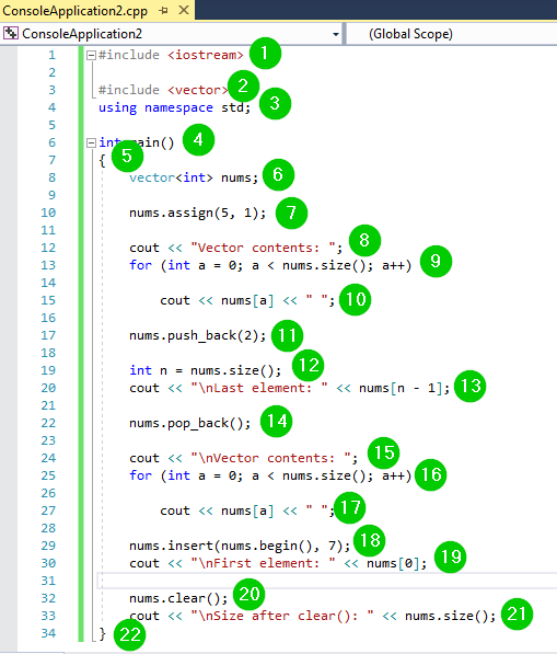 - 声明一个名为 nums 的 vector 来存储一些整数值。