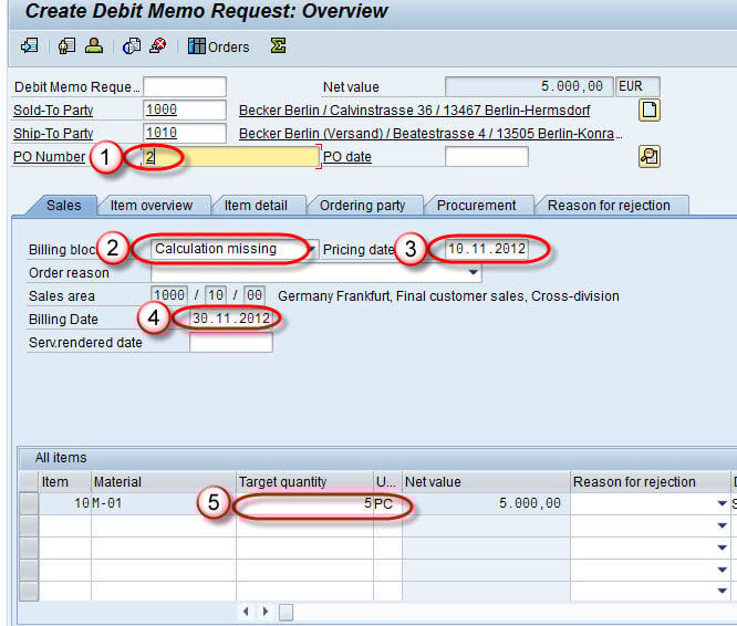 - 在订单类型中输入借项通知单请求。