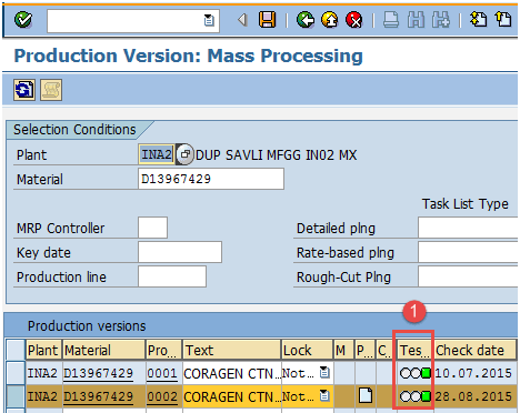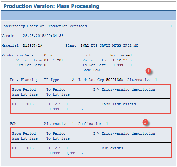 检查物料清单是否存在于生产版本的有效期(2015 年 1 月 1 日 – 9999 年 12 月 31 日)和批次范围(0 – 9999999999999)中。
