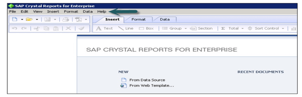 企业版 Crystal Reports 提供了一个界面,允许您创建、格式化和发布有效的报告。Crystal Reports 的菜单栏提供了下图所示的广泛功能。