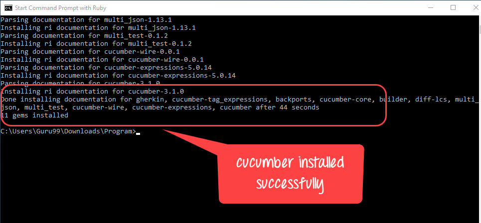 步骤 1) 在 Ruby cmd 中输入“gem install cucumber”。此命令将在命令行本身下载并安装 Cucumber