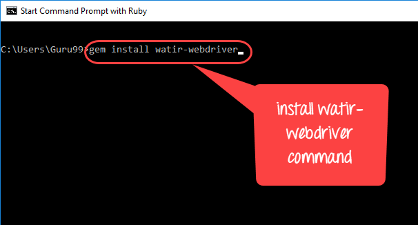 步骤 1) 点击“用 ruby 启动命令行提示符”并安装命令“gem install watir-webdriver”
